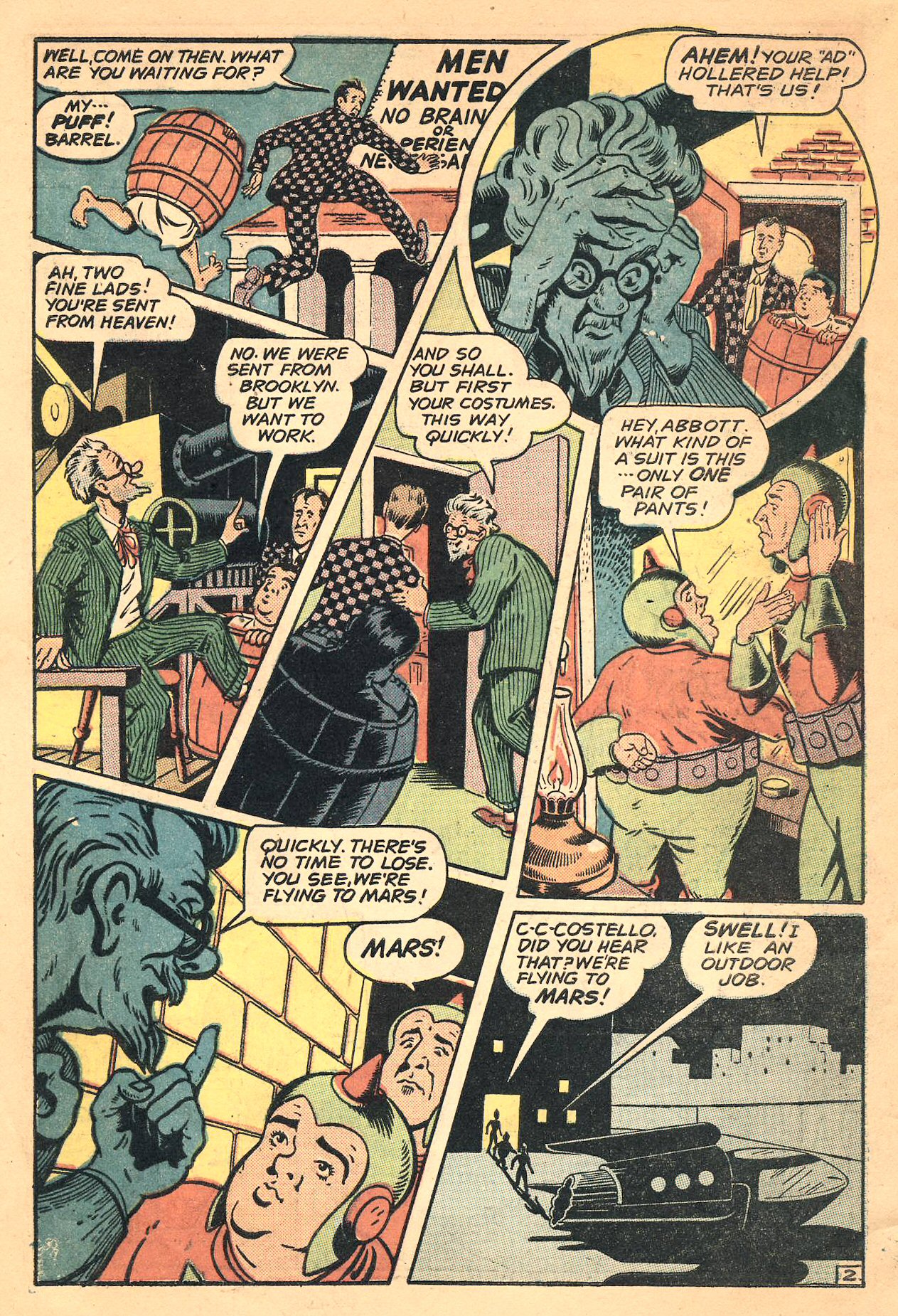 The comedy team of Abbott & Costello had a comic book in the 1940s, largely because of the popularity of their radio show. “About Space” comes from St. John’s Abbott & Costello Comics #3 (July 1943). It was written by John Graham. The artwork is by Lily Renee and Eric Peters. In 1953, the duo would film Abbott & Costello Go To Mars, starring Mari Blanchard as Queen Allura. The film had nothing to do with the comic. This comic is in the public domain.